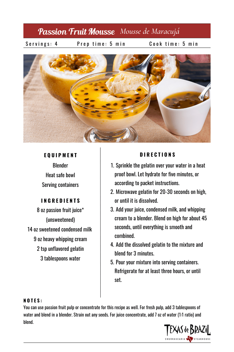 Mousse de maracujá is a national favorite in Brazil. It is as ubiquitous in restaurants and bakeries as chocolate cake is in America. Its velvety texture and unique flavor make a stylish end to any meal, and its simplicity makes it a favorite for cooks in a hurry.