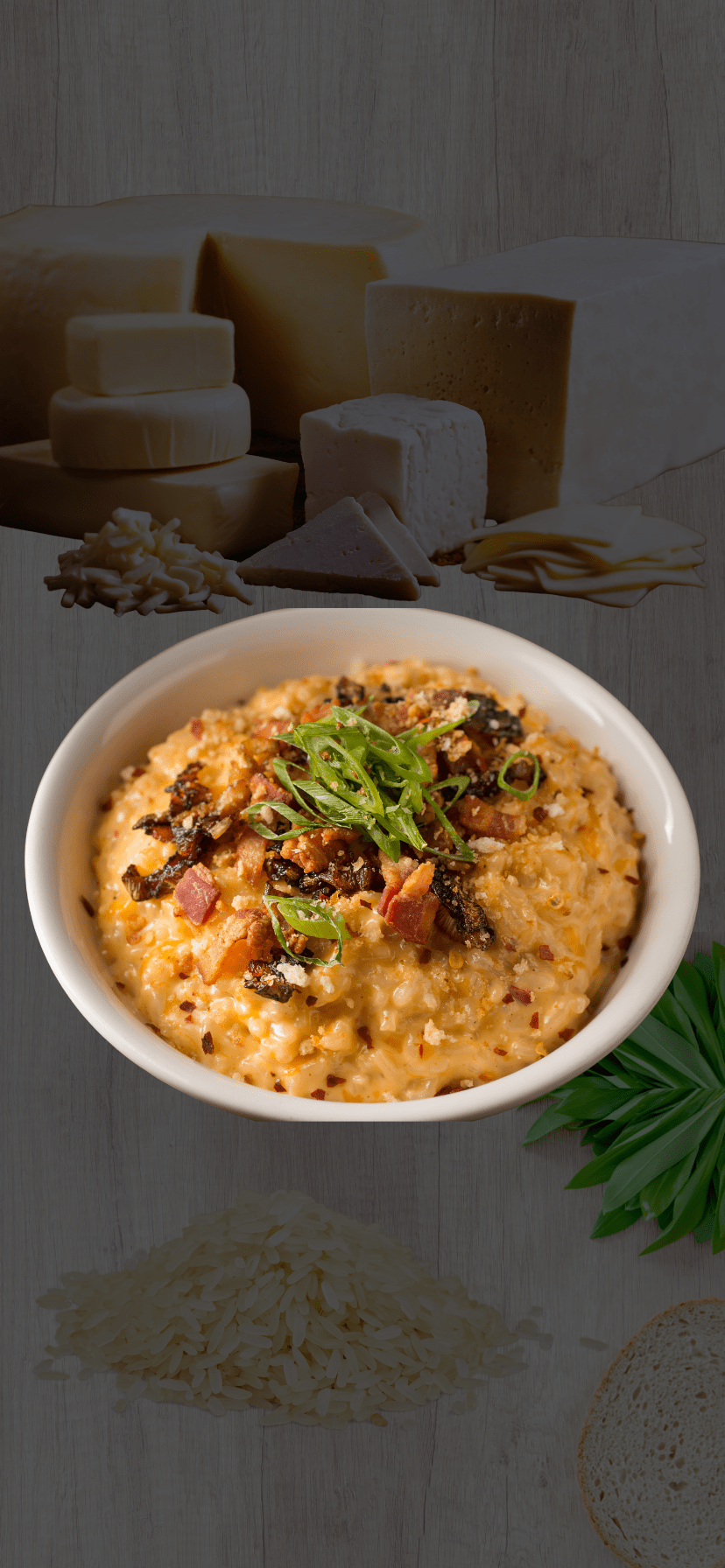 5. Pour the cheese, cream, and rice mixture into the greased baking dish. Sprinkle the top with the Asiago cheese.